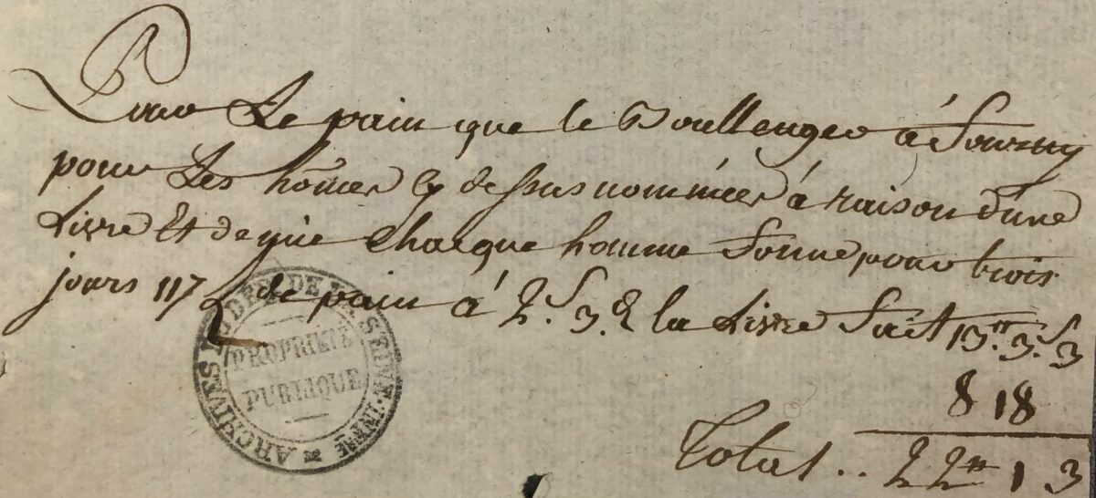 Somme pour trois jours 117 livres de pain à 2 sous 3 deniers la livre, soit 13 livres 3 sous et 3 deniers.