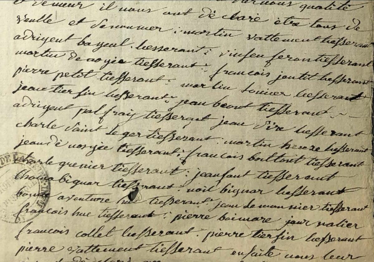 « L’an 1791, le 24 du mois d’août, nous Charles Marcel et Pierre Langlois gendarmes nationaux au Département de la Seine Inférieure résidence de Cany soussignés certifions que vertu de réquisition de messieurs les administrateurs composant le Directoire de Cany aux fins de nous transporter en la paroisse de Blosseville avec un détachement de douze hommes du régiment Royal-Bourgogne1 pour main-forte nous y sommes transportés en étant dans la dite paroisse environ une heure après midi. Nous avons aperçu un grand attroupement de peuple avec des râteaux et des cordages nous nous sommes approchés d’eux et nous leur avons demandé où ils allaient. Ils nous ont répondu qu’ils s’en allaient râteler du chaume. Nous leur avons observé qu’ils étaient sur le territoire de Blosseville et qu’ils n’avaient pas le droit de s’en venir prendre le chaume du laboureur. Ils nous ont répondu que le chaume appartenait aux pauvres. Nous les avons sommés de venir par devant la municipalité de Blosseville, à quoi ils ont obéi en même temps nous leur avons fait mettre bas leurs râteaux. Et les moissonneurs de monsieur Hochet se sont trouvés là qui nous ont déclaré que la plus grande partie de tous ceux-là étaient ceux qui étaient venus la veille dans le champ de leur maître prendre le chaume malgré eux et malgré leur maître. Ensuite nous leur avons demandé leur nom surnom qualité et demeure. Ils nous ont déclaré être tous de Veules et demeurer »2.