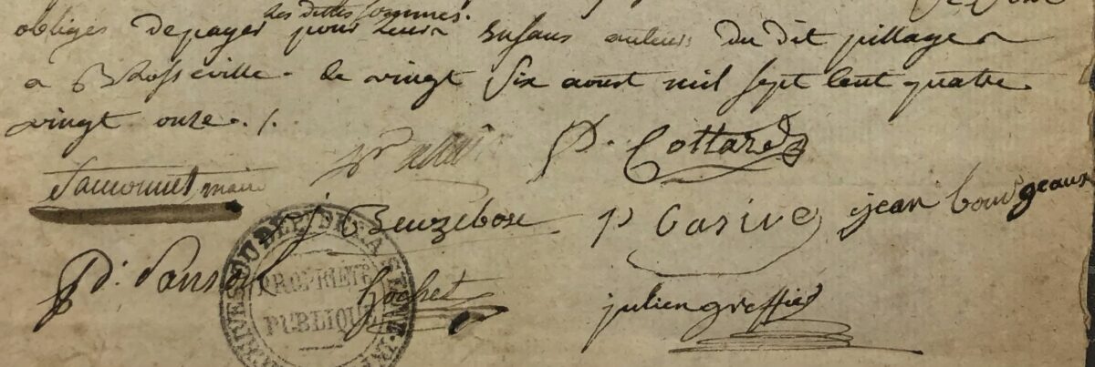 Sur la première pièce où nous avons trouvé dans différents endroits beaucoup de chaume enlevé et …avons estimé le dommage à 27 livres. Dans la seconde…nous avons estimé la valeur du dommage à la somme de 13 livres. Lequel dommage constaté nous avons appelé le sieur Louis Hochet et lui avons communiqué la valeur de l’estimation…lequel a déclaré accepter et que les dessus dénommés se sont obligés de payer les dites sommes pour leurs enfants auteurs du dit pillage à Blosseville le 26 août 1791.