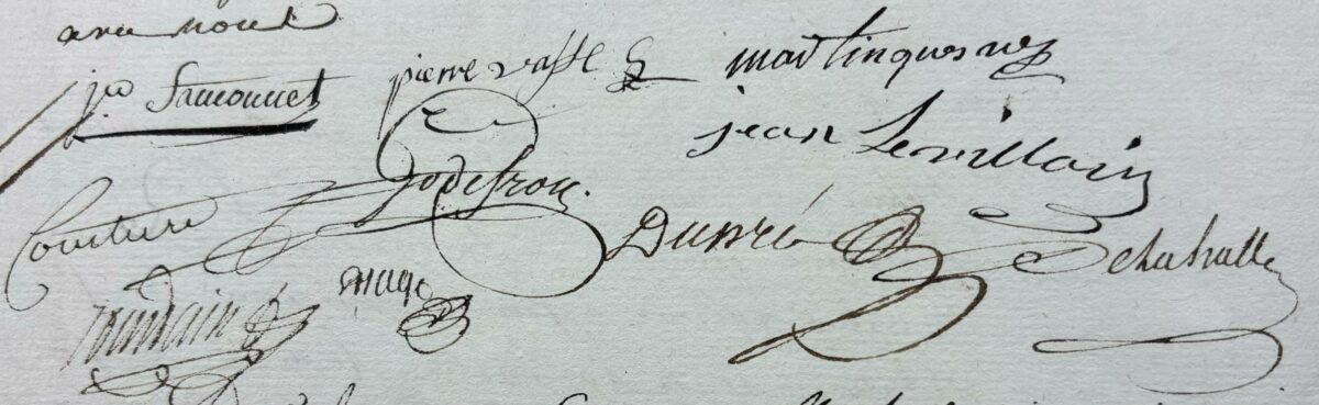 «En fait nous leur avons déclaré que nous entendions les arrêter et les constituer prisonniers dans les prisons royales au district de Cany. A quoi ils ont obéi pourquoi nous avons fait et rédigé le présent notre procès verbal pour être déposé au greffe du tribunal de Cany et pour servir et faire valoir au cas qu’il appartiendra. Les jour et an que fut dont acte ».